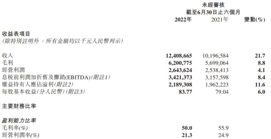 事实上,2022年上半年公司的盈利指标已经下滑,毛利率、经营利润率、权益持有人应占溢利率分别为50.0%、21.3%、17.6,较上年同期减少5.9个、3.6个、1.6个百分点。毛利率几乎又回到2019年同期49.7%、2020年同期49.5%水平,而利润率降幅略小或与费用率表现较为平稳有关。