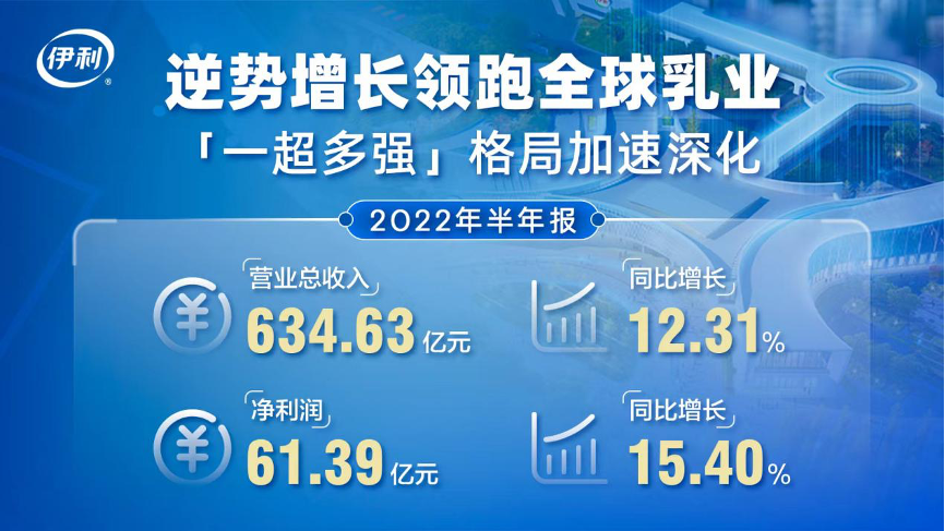 8月30日,伊利股份披露的半年度业绩报告显示,2022年上半年,公司实现营业总收入634.63 亿元,同比增长12.31%;实现净利润61.39亿元,同比增长15.40%,再创新高。