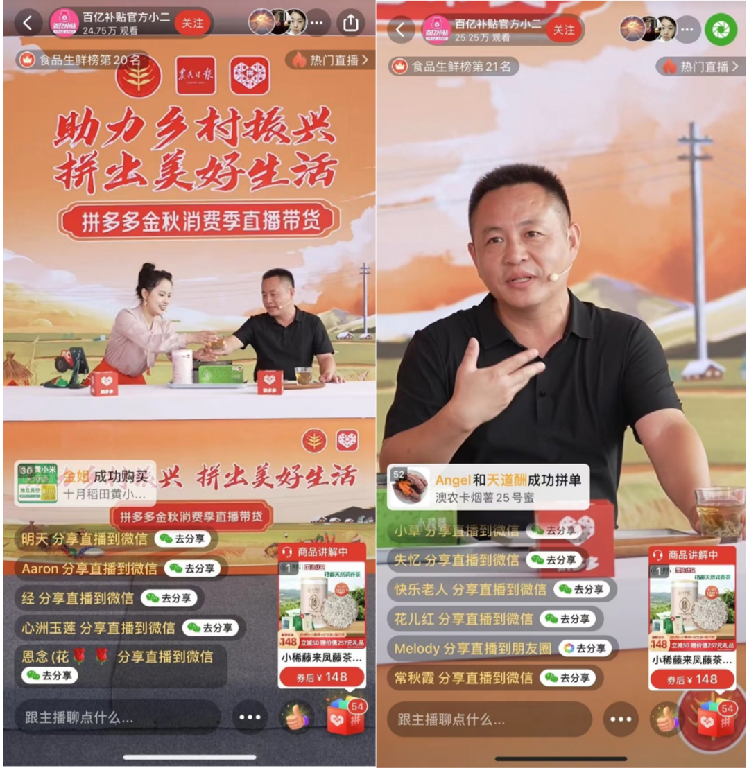 启动仪式现场,河南省洛宁县、四川省仪陇县、湖北省来凤县、湖南省永顺县、湖南省龙山县、贵州省剑河县等12个国家乡村振兴重点区县接力参与助农直播带货活动。各地政府有关负责同志携手农民代表走进拼多多直播间,为全国观众推介当地的特色农产品,来凤藤茶、龙山百合、长顺苹果、石城客家酒酿等50余款优质地标农产品亮相直播活动。