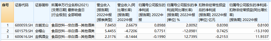Wind数据显示,今年上半年,古越龙山是三家酒企中唯一一家实现营收利润双增的企业,上半年分别实现营收和利润7.85亿元和0.90亿元,分别同比增长2.67%和2.01%。会稽山虽然营收和利润同比双降,但仍实现了盈利,上半年分别实现营收和利润5.45亿元和0.78亿元。金枫酒业在三家酒企中表现垫底。