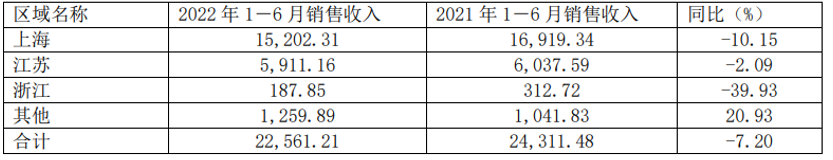 金枫酒业上半年在江浙沪地区销售收入下降(万元)