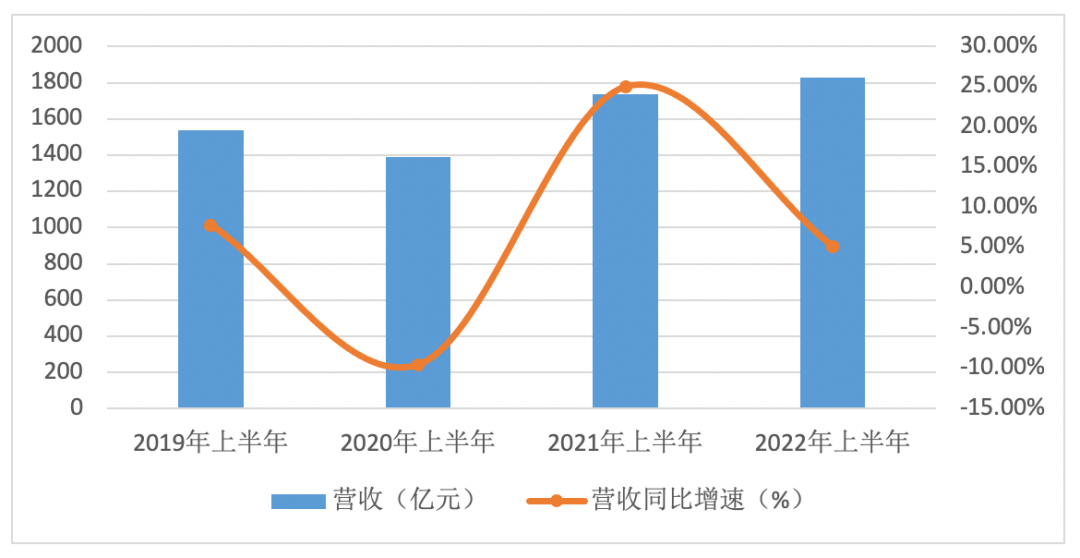 美的集团2018年上半年至2022年上半年营收及同比增速(亿元、%)
