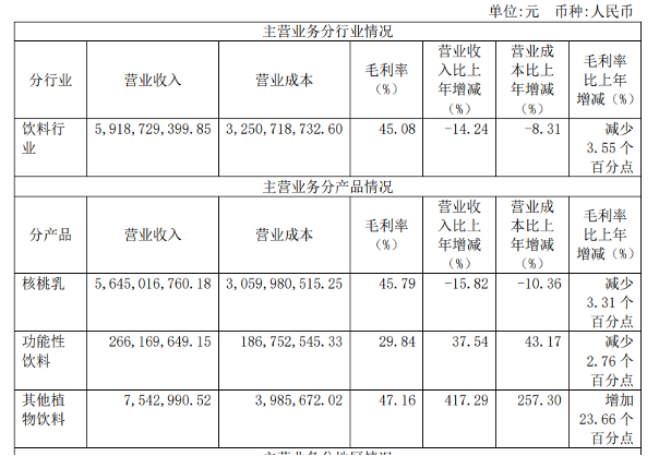 其中,核桃乳是该公司的绝对主要收入来源,全年实现收入56.45亿元,占公司全年总收入的95.31%。不过这部分收入较上年同期下降了15.82%,毛利率也减少了3.31个百分点至45.79%。