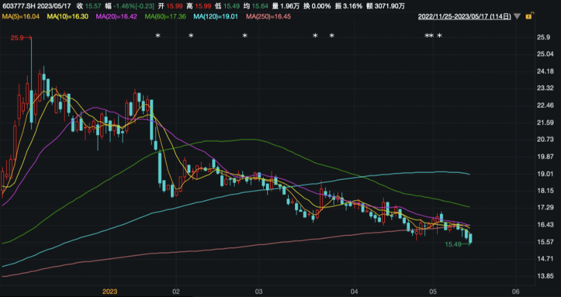 二级市场方面,自2022年末起,公司股价震荡走低。截至5月17日收盘,来伊份股价报于15.57元/股,较2022年12月6日25.9元/股的阶段高点已累计下跌39.88%;较上市初期创下的股价最高点58.05元/股,累计下跌73.18%。