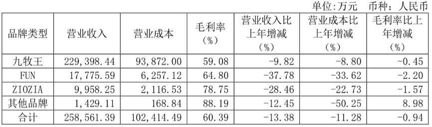 年报数据显示,2022年,该公司九牧王品牌业务营收达22.94亿元,营收占比高达88.72%,而同期FUN、ZIOZIA品牌业务贡献的营收分别为1.78亿元、9958.25万元,营收占比分别为6.87%和3.85%。