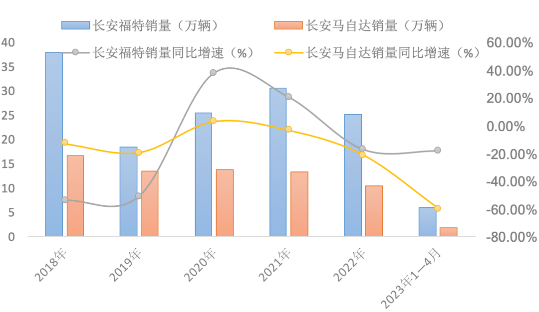 值得注意的是,今年前四个月,该公司自主品牌汽车销量同比增长“个位数”,长安福特、长安马自达的销量均同比下滑,后者降幅近六成。若拉长时间来看,长安福特与长安马自达合计销量占比也降至10%以下,与2017年、2018年时相比落差较大。自主强、合资弱的局面较为明显。