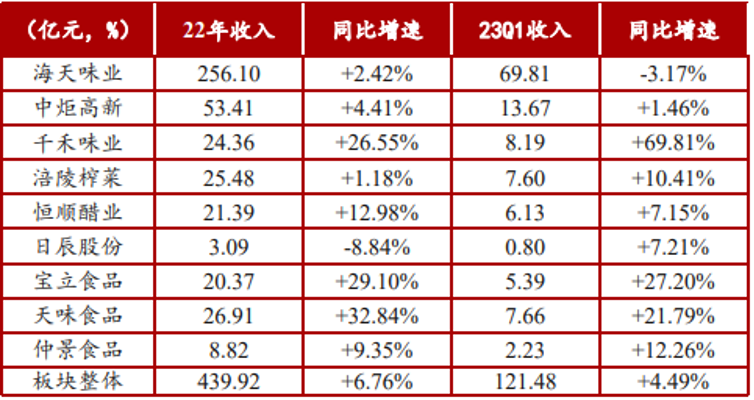 浙商证券研报统计数据显示,在A股调味品上市企业中,海天味业不仅在2022年的营收增速低于该板块整体增速,且在2023年第一季度的收入增速呈现负增长且低于行业整体水平。