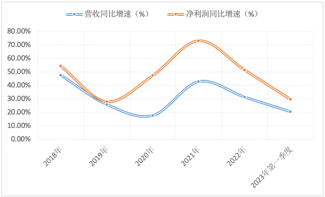 《投资时报》研究员注意到,2022年公司业绩增速有所回落,收入与净利润同比增速分别为31.26%、51.34%,较上年放缓一、二十个百分点。2023年第一季度,增速再次放缓至20.44%、29.64%。且2023年,公司定下的营收增长目标为20%,较为谨慎。
