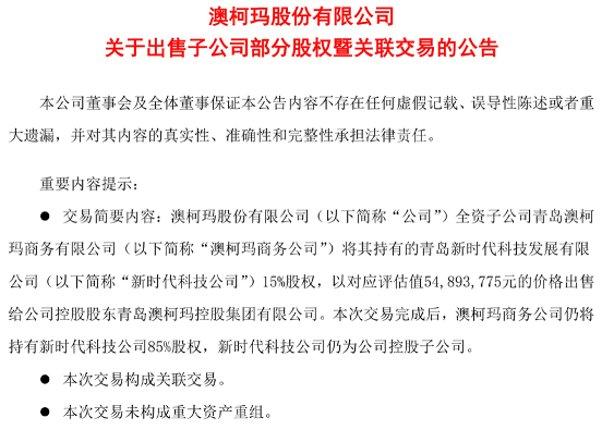 9月27日,澳柯玛发布公告称,公司全资子公司澳柯玛商务公司与青岛澳柯玛控股集团有限公司签署了《股权转让合同》,同意将其持有的新时代科技公司15%股权转让给澳柯玛控股集团,转让价格为5489.38万元。而因后者正是澳柯玛的控股股东,所以上述交易构成关联交易。