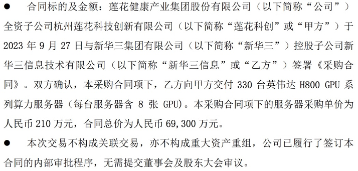 近日,莲花健康公告称,公司全资子公司莲花科创于9月27日与新华三集团有限公司(下称新华三)控股子公司新华三信息签署《采购合同》,合同显示,莲花科创拟向新华三信息购买330台英伟达H800GPU系列算力服务器(每台服务器含8张GPU),合同总价为6.93亿元。