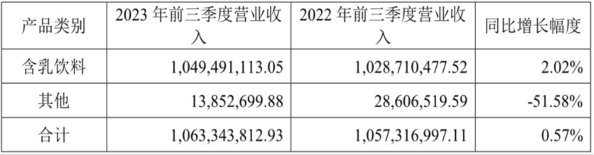 今年前三季度,李子园的含乳饮料合计实现营收10.49亿元,同比增长2.02%,占公司主营业务收入的比重为98.68%;其他产品较去年同期减少51.58%,合计营收减少至1385.27万元。