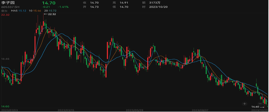 或受股份回购利好影响,公告发布当日,李子园股价小幅度回升,上涨2.66%。但股价的下跌并未因回购而结束,截至10月23日收盘,该股收跌1.02%,报于14.55元/股,总市值57.55亿元。
