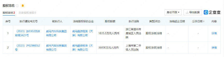 不过,今年以来,威马汽车温州生产基地公司主体——威马汽车制造温州有限公司和黄冈生产基地公司主体——湖北星晖新能源智能汽车有限公司均已多次被冻结股权,其中后者还被上海一家制造业供应商申请破产重整。