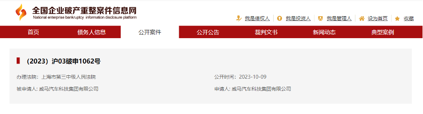 据企查查信息显示,10月9日,威马汽车科技集团有限公司(WM Motor,下称威马汽车科技集团)新增一条破产重整信息,该公司向上海市第三中级人民法院申请破产审查,案号为(2023)沪03破申1062号。
