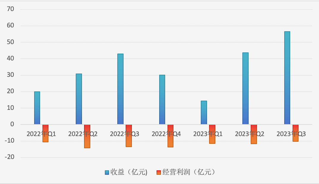 零跑汽车2022年Q1至2023年Q3收益及经营亏损情况(亿元)