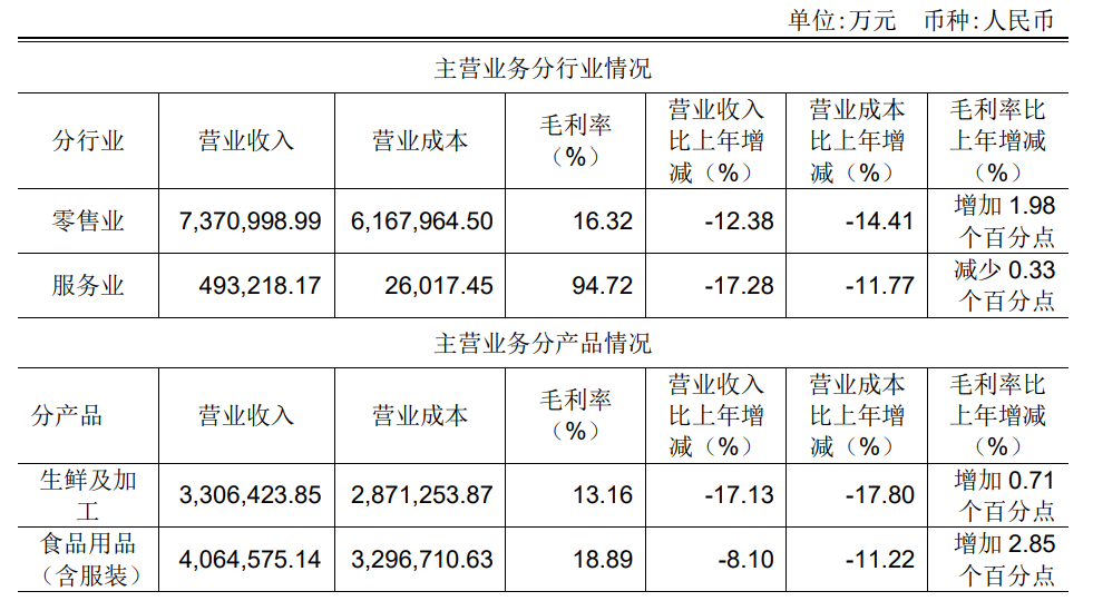 分行业来看,永辉超市的收入来源于零售业和服务业两部分,其中零售业是该公司的主要收入来源。2023年,永辉超市零售业和服务业分别实现营收737.10亿元和49.32亿元,分别同比减少12.38%和17.28%,营业成本也由此分别下降了14.41%和11.77%。