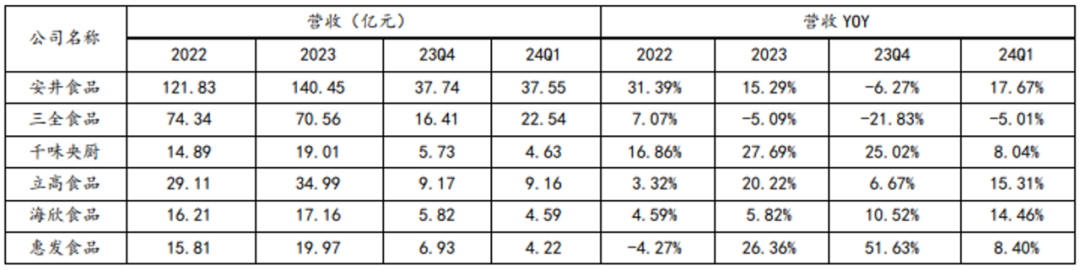 在安井食品、三全食品、千味央厨、立高食品、海欣食品、惠发食品六家A股速冻食品公司中,三全食品是唯一一家2023年营收出现下滑的公司