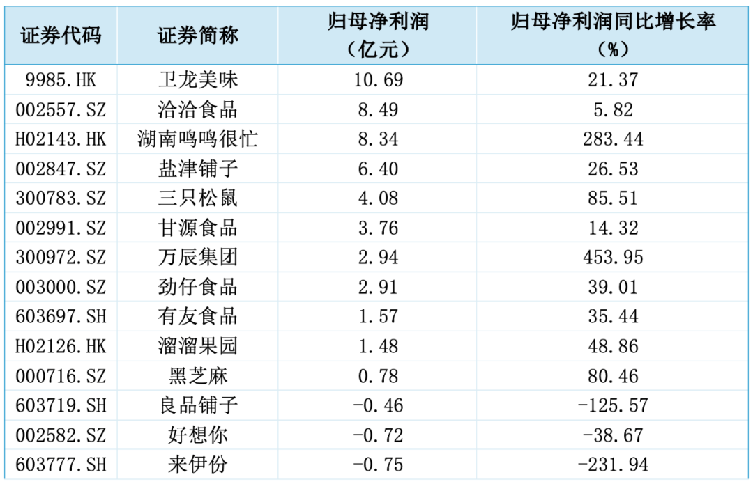 此外,依托量贩零食渠道,盐津铺子(002847.SZ)、三只松鼠(300783.SZ)、甘源食品(002991.SZ)也实现了利润增厚,2024年三家企业分别录得归母净利润6.40亿元、4.08亿元、3.76亿元。