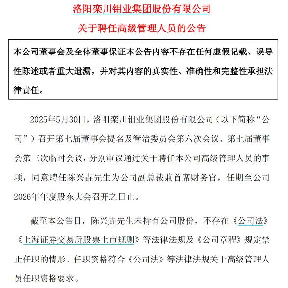 此外,值得一提的是,5月30日,洛阳钼业(603993.SH)发布了人事变动公告,公司董事会同意聘任陈兴垚为公司副总裁兼首席财务官,任期至公司2026年年度股东大会召开之日止。