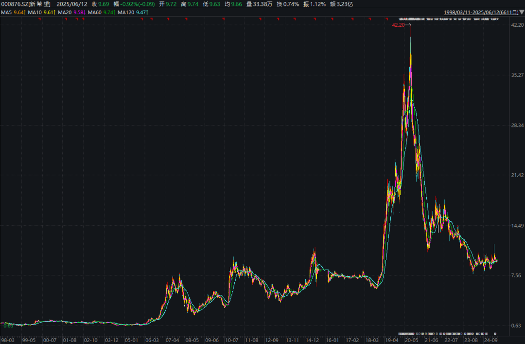 Wind数据显示,新希望2022年7月25日的收盘价为15.94元/股,截至6月12日收盘,该公司报收于9.69元/股,较上述股票授予价上涨约21.4%,较授予时的公司股价下挫39.2%,并较该公司于2020年9月2日盘中触达的42.20元/股的历史最高点下挫约77%。