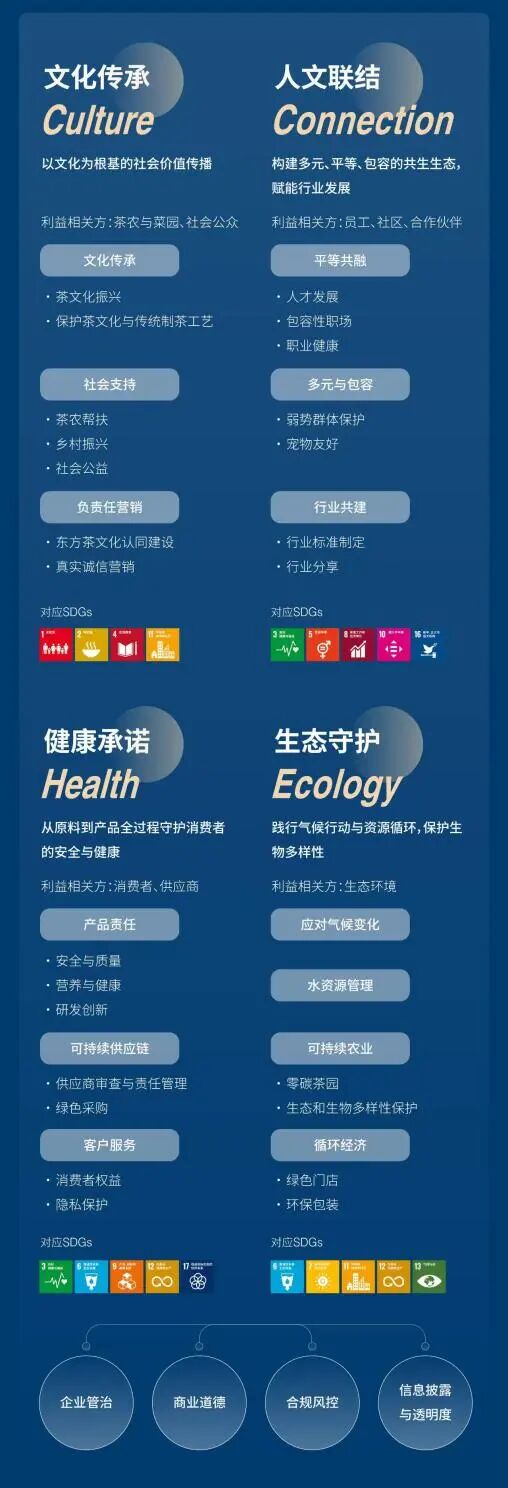 报告显示,霸王茶姬主要从文化传承、健康承诺、人文联结、生态守护、公司治理等五个方面着手,将可持续发展理念融入从茶园到茶杯的全产业链。同时,以一杯茶为纽带,串联起文化传承、产业共赢与生态守护等多个领域,实现商业、文化与环保等多重责任担当。