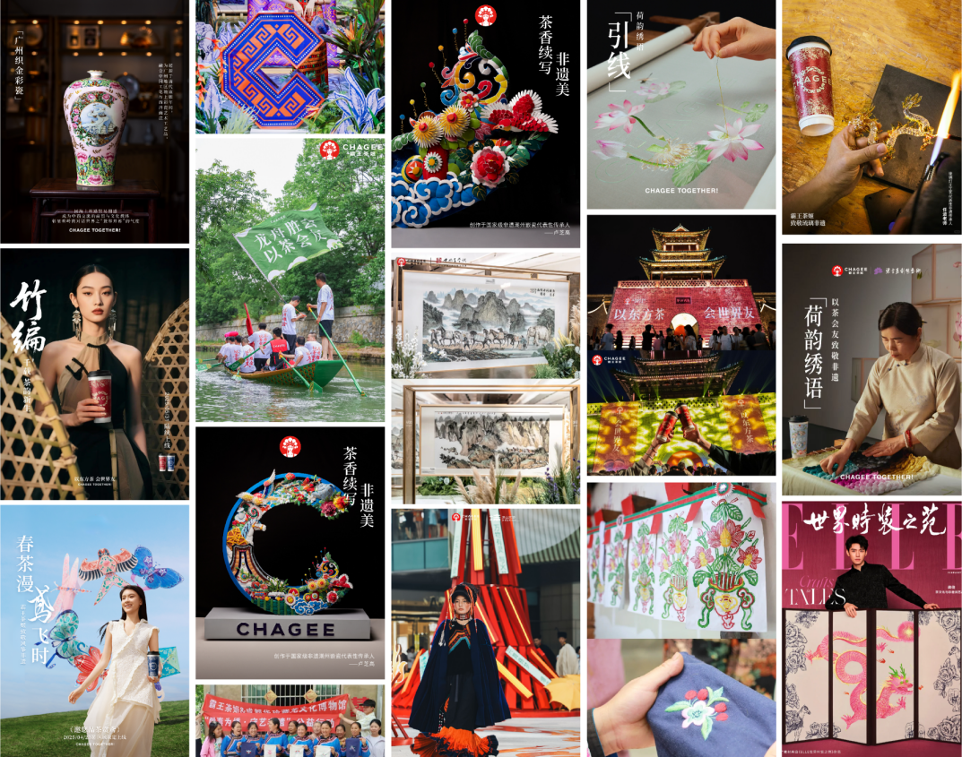 2024年,霸王茶姬在广西南宁推出了融合传统壮锦纹样的系列文创产品,在贵州发起 “茶香起,苗绣现”致敬非遗主题活动,在江西景德镇与元青花非遗传承人携手提取青花钴蓝与经典纹样融入定制茶器与周边,让千年非遗美学通过现代设计重回生活。