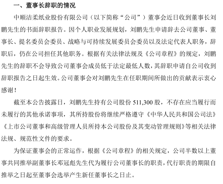 纸业巨头中顺洁柔纸业股份有限公司(下称中顺洁柔,002511.SZ)公告显示,董事会近日收到董事长刘鹏的书面辞职报告,因个人职业发展规划,刘鹏申请辞去公司董事、董事长、提名委员会委员、战略与可持续发展委员会委员以及法定代表人职务,辞职后仍在公司担任其他职务。