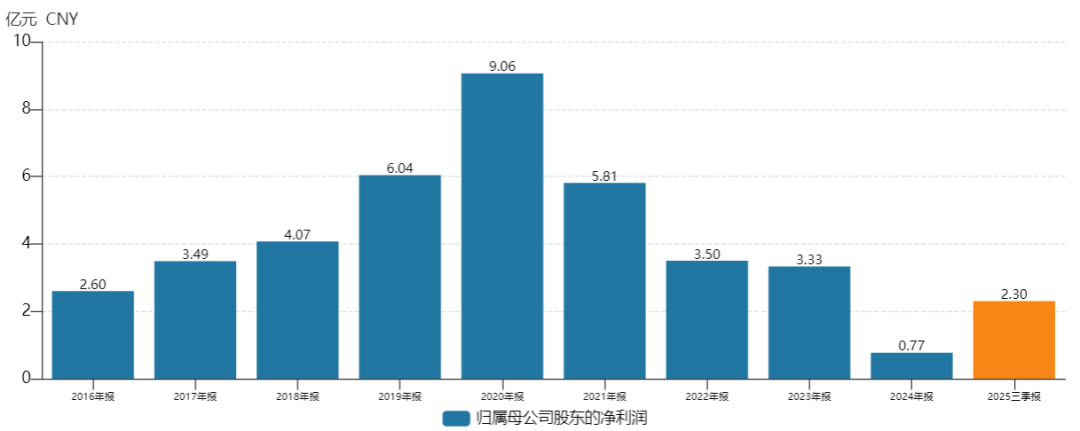 数据显示,2020年至2024年,公司营收分别为78.24亿元、91.5亿元、85.7亿元、98.01亿元和81.51亿元,自2021年起虽有所提升,但波动明显,且始终未突破100亿大关。同期,公司归母净利润分别为9.06亿元、5.81亿元、3.50亿元、3.33亿元和0.77亿元,不仅持续滑坡,且降幅明显,2024年降幅更是达到76.8%。