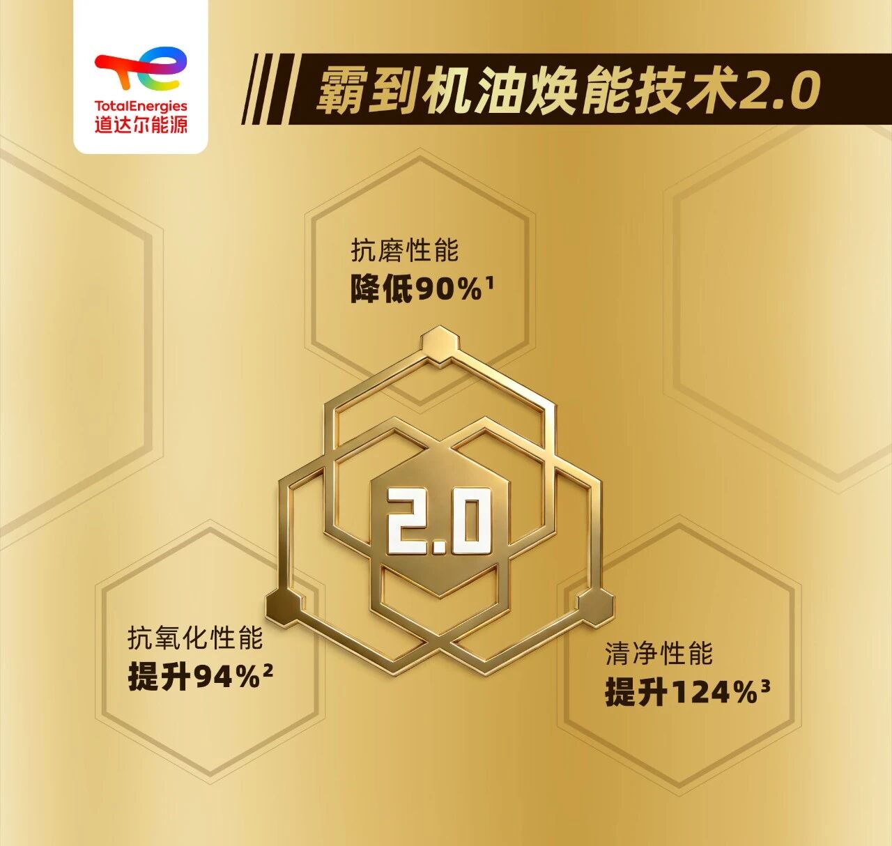 此次全新升级的霸到机油,搭载了道达尔能源独家的焕能技术2.0,在抗磨、抗氧化及清洁三大性能维度均实现了显著突破。