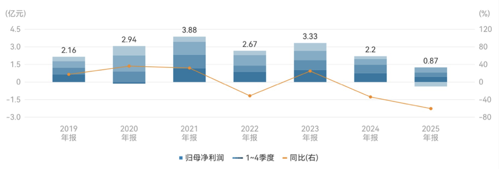 最新年报数据显示,公司2025年全年营收为35.08亿元,同比减少10.96%;归母净利润为8731.78万元,同比下滑60.37%;扣非净利润为8317.99万元,同比减少60.15%。