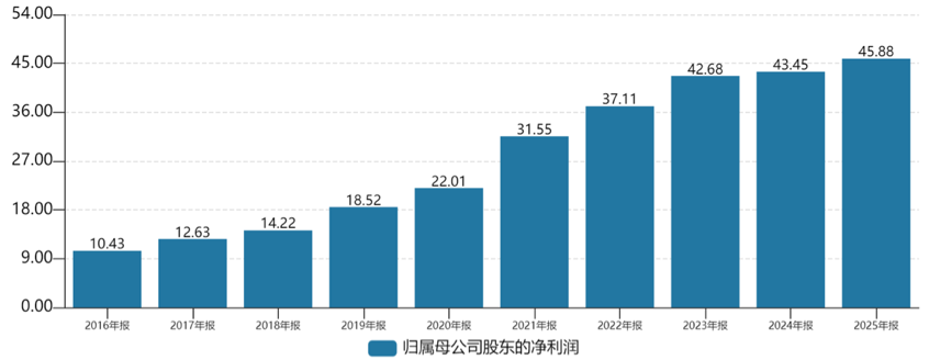 难能可贵的是,青岛啤酒近十年来归母净利润始终保持稳健攀升轨迹,成为公司领跑行业的核心印证。Wind数据显示,2016年—2025年,青岛啤酒归母净利润从10.43亿元逐年增长至45.88亿元,十年间增长超3.4倍,连续多年保持行业领先。