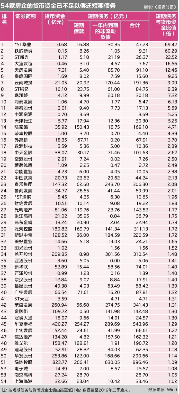 截至9月末,有54家A股房企的短期债务高于货币资金,亦即短期债务与货币资金的比值大于1倍,意味着公司现有货币资金不足以偿还短期债务。按比值由高至低排序,排在榜首的是*ST华业,该公司三季度末短期借款为16.88亿元,一年内到期的非流动负债为30.35亿元,二者合计47.23亿元。而同期货币资金只有0.68亿元,短期债务与货币资金的比值高达69.47倍,存在46.55亿元的缺口。