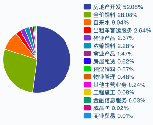 虽然公司行业分类仍在农产品领域,但康达尔超过半数的营收来自房地产开发业务。2018年年报显示,康达尔房地产业务当年实现17.9亿元营收,占总营收比例超过半数,达52%。另外占比较大的业务为全价饲料,2018年营收达9.65亿元,占比28%,其他业务还包括自来水供应、出租车客运、猪业产品、浓缩饲料、禽业产品、物业管理、金融投资等。
