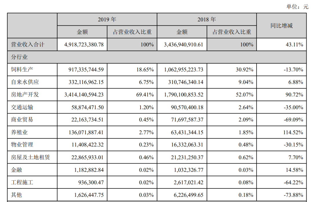 据京基智农2019年年报显示,该公司全年实现营业收入49.19亿元,同比增长43.11%。其中房地产开发业务实现收入34.14亿元,同比增长90.72%,占总营收的69.41%,毛利率达67.62%;饲料生产业务实现收入9.17亿元,占总营收的18.65%;养殖业业务实现收入1.36亿元,占总营收的2.77%,其中禽业产品实现收入1.13亿元,占总营收的2.31%,猪业产品实现收入4434.81万元,占总营收的0.90%。