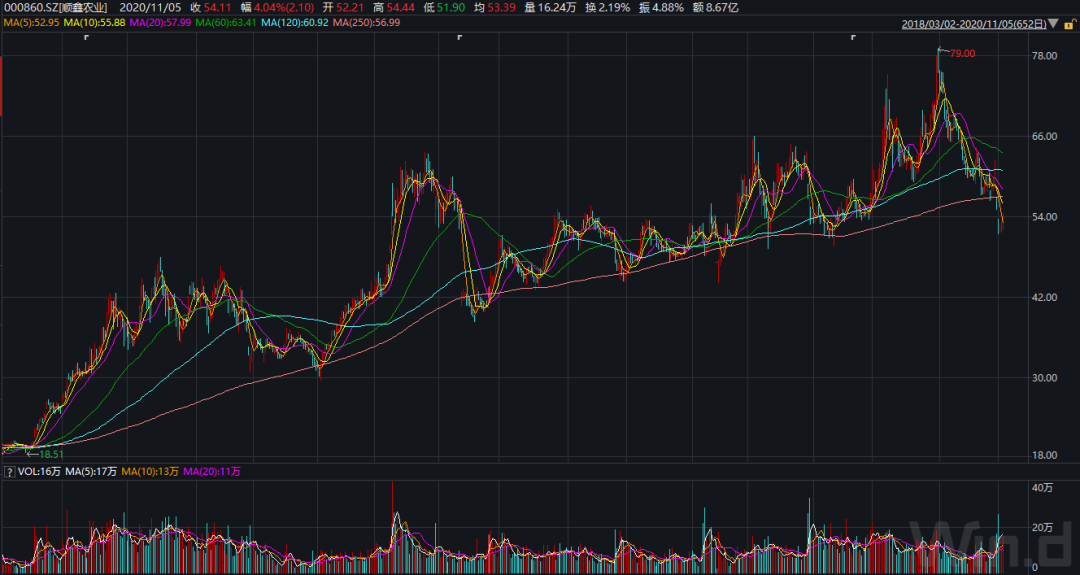 需要注意的是,在第三季度顺鑫农业的十大股东中,包括控股股东在内,已有五家机构股东进行了减持。截至2020年11月6日,顺鑫农业报收于54.31元/股,较52周高点已下挫31.25%,市值为403亿元。