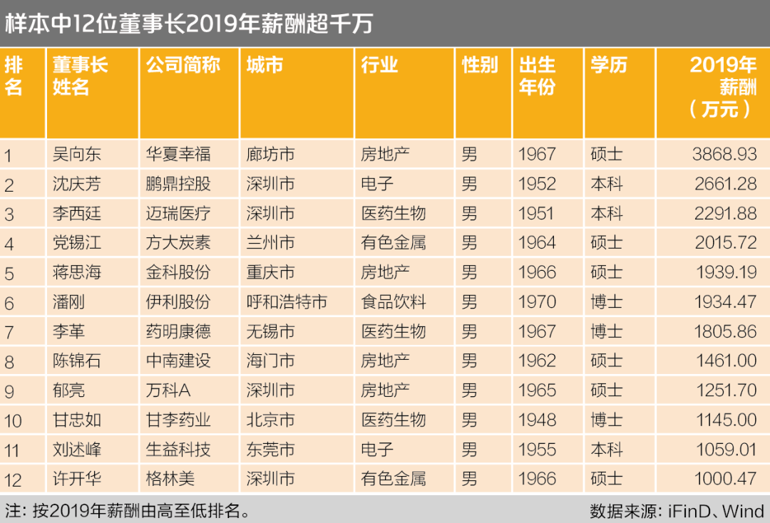 2019年薪酬达到百万元及以上的有1049人,其中12人的薪酬达千万元级别,由高至低分别是华夏幸福(600340.SH)吴向东、鹏鼎控股(002938.SZ)沈庆芳、迈瑞医疗(300760.SZ)李西廷、方大炭素(600516.SH)党锡江、金科股份(000656.SZ)蒋思海、伊利股份(600887.SH)潘刚、药明康德(603259.SH)李革、中南建设(000961.SZ)陈锦石、万科A(000002.SZ)郁亮、甘李药业(603087.SH)甘忠如、生益科技(600183.SH)刘述峰、格林美(002340.SZ)许开华。
