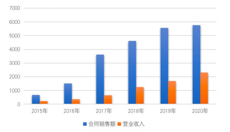 同时,查阅融创往年销售额数据,《投资时报》记者注意到,2015年至2020年,融创合同销售额从682.1亿元增至5752.6亿元,增幅达743.37%,年均复合增长率高达53.18%。同期,其营业收入从230.1增至2305.9亿元,涨幅高达900%,年均复合增长率58.56%。据亿翰智库预计,2021年融创将实现6356亿元销售金额,同比增速超10%。