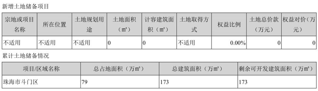 该公司2020年半年报显示,截至2020年6月末,世荣兆业土地储备均位于珠海市斗门区,累计土地储备总占地面积为82万平方米,总土储的建筑面积为179万平方米;截至今年6月末,世荣兆业在斗门区内拥有土地储备79万平方米,总建筑面积173万平方米,几乎没有任何变化。
