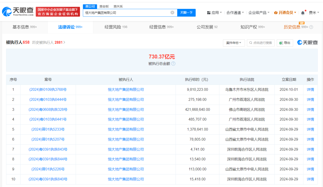 恒大地产集团有限公司现存650余条被执行人信息,被执行总金额超730亿元