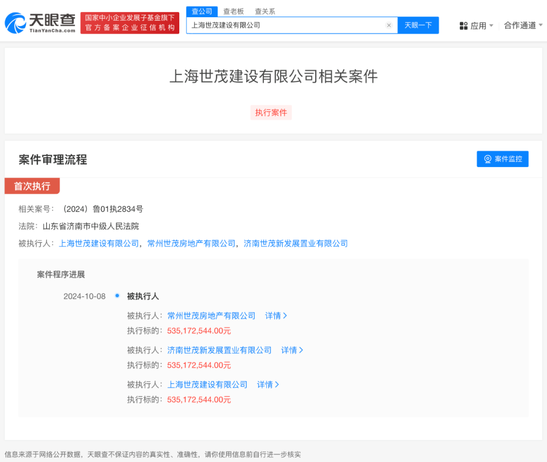 天眼查法律诉讼信息显示,近日,上海世茂建设有限公司、济南世茂新发展置业有限公司、常州世茂房地产有限公司新增一条被执行人信息,执行标的5.3亿余元,执行法院为山东省济南市中级人民法院。