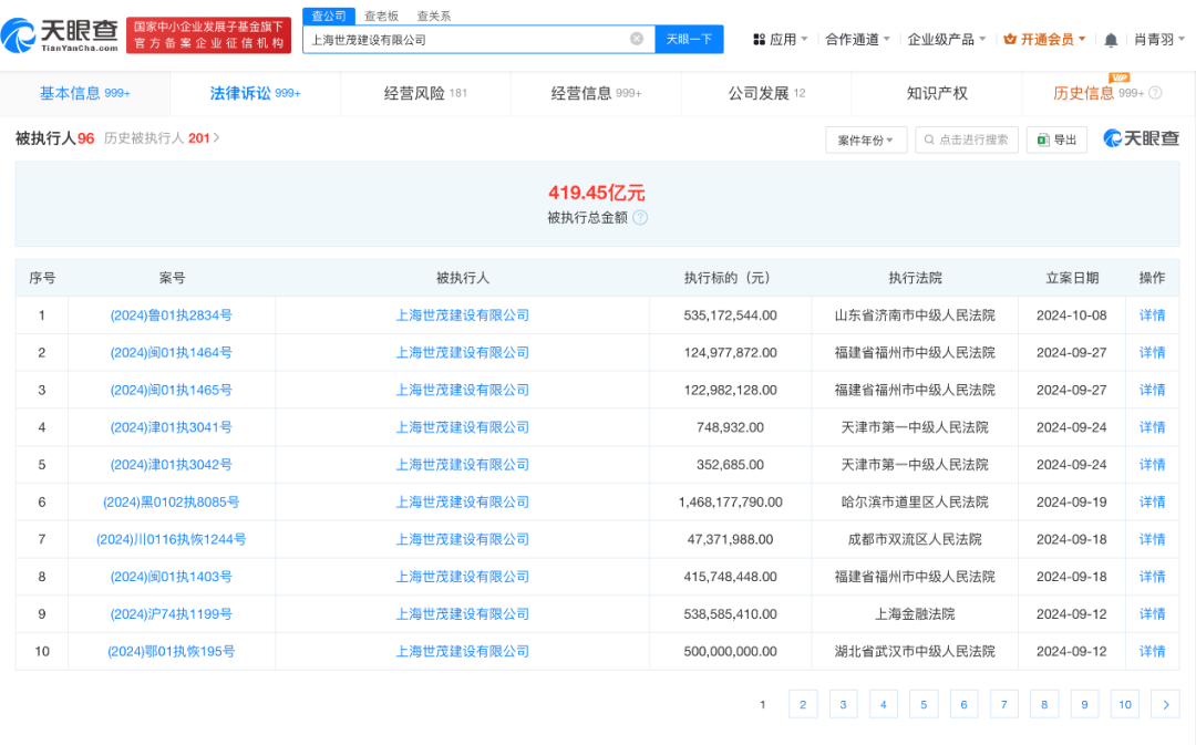 风险信息显示,上海世茂建设有限公司现存90余条被执行人信息,被执行总金额超419亿元。此外,该公司还存在多条限制消费令、失信被执行人(老赖)及终本案件信息。