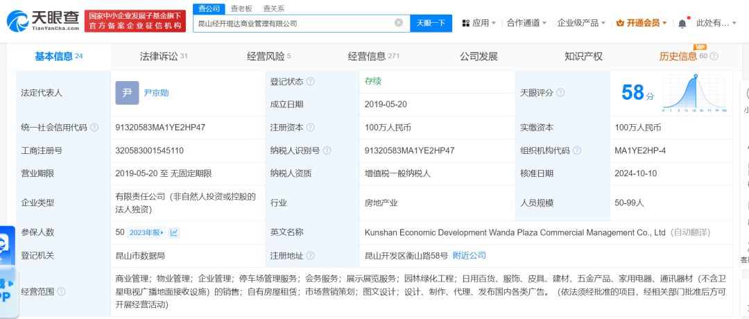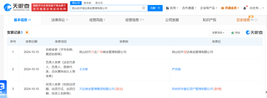 天眼查App显示,近日,昆山经开万达广场商业管理有限公司发生工商变更,企业名称变更为昆山经开琨达商业管理有限公司,原全资股东万达商业管理集团有限公司退出,新增苏州苏华盈石资产管理有限公司为股东并全资持股,同时,多位主要人员均发生变更。