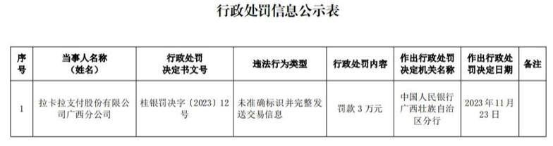 中国人民银行网站12月1日发布的信息显示,今年11月23日,中国人民银行广西壮族自治区分行决定对拉卡拉广西分公司罚款3万元,主要因未准确标识并完整发送交易信息。