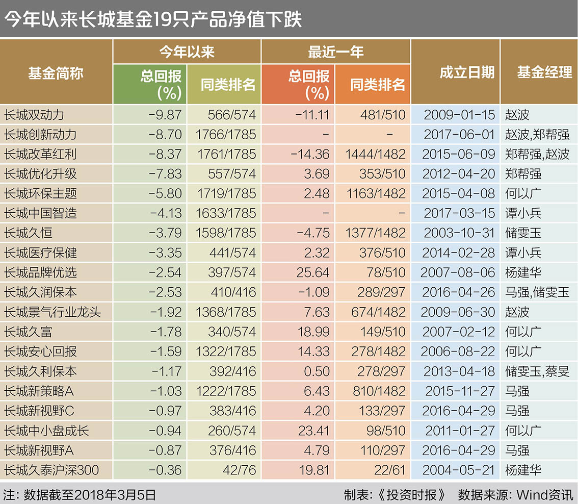 按不同份额分开计算,长城基金旗下58只基金今年以来收益率平均为-0.54%,其中有19只基金净值下跌。