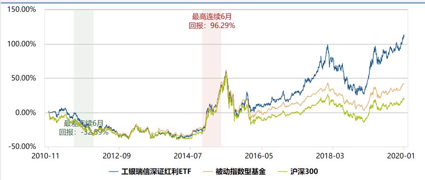 其一,收益率情况。截至2020年1月16日,自2011年初成立9年来,工银深证红利ETF累计收益高达109.63%,远超同期沪深300指数19.21%、被动指数型基金平均40.91%的总回报,成为名副其实的“翻倍基”。从年化回报数据看,工银深证红利ETF为8.37%,在59只同类基金中高居第1,同期可对比的沪深300指数、被动指数型基金均值分别为1.93%、3.80%,超额收益明显。
