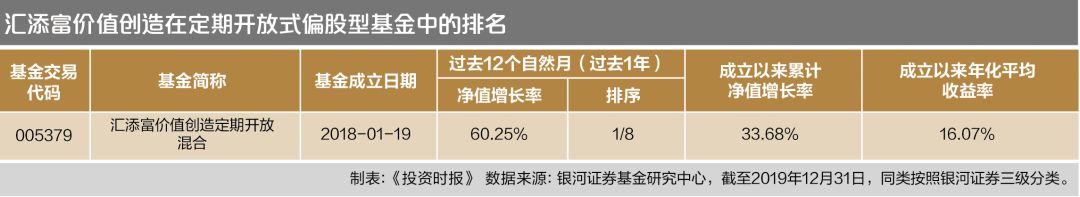 此外,同样由胡昕炜管理的聚焦“价值创造型企业”的汇添富价值创造定开混合基金在2019年斩获了60.25%的收益,高居同类第一,成立以来的业绩也在同类中位居榜首。