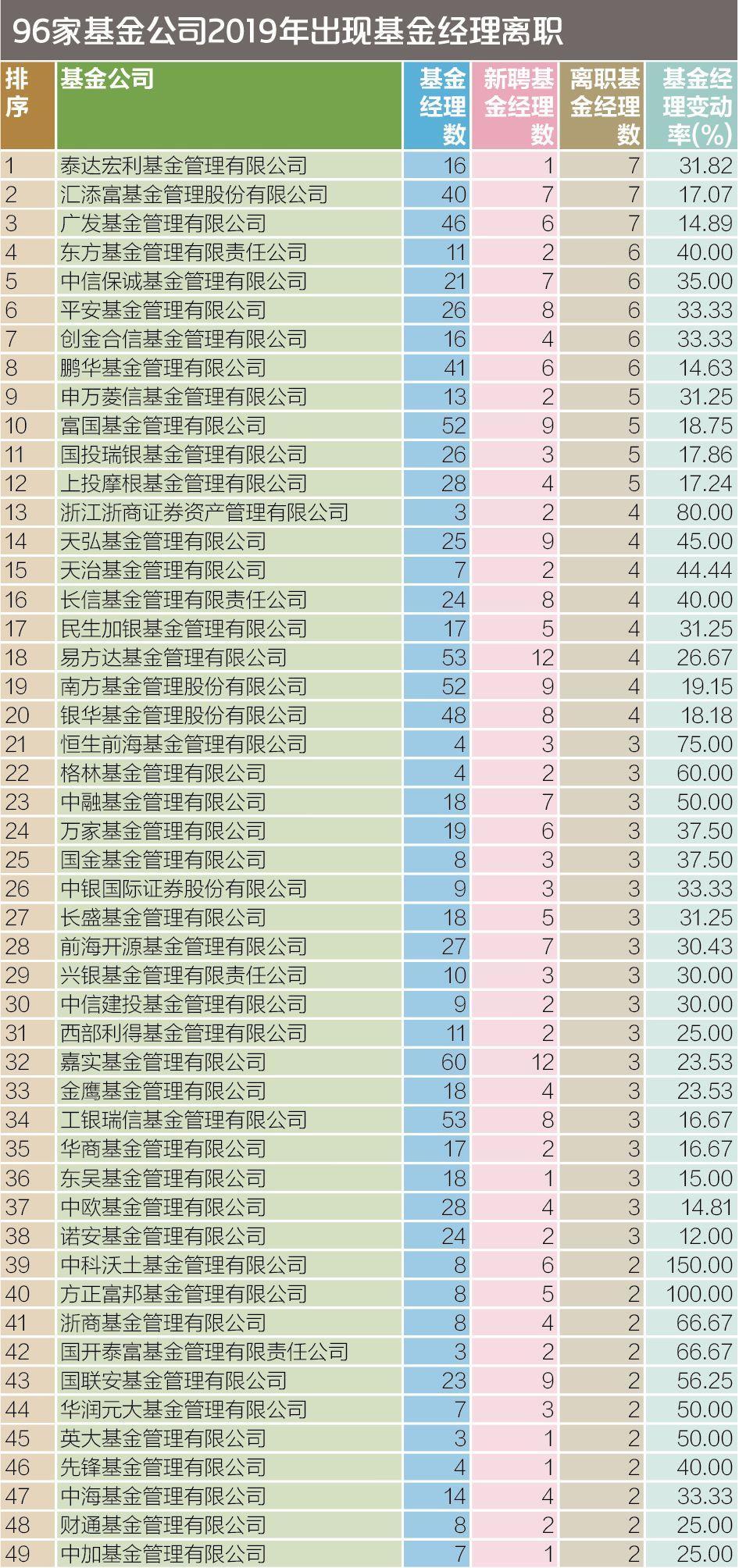 去年发生基金经理离职的96家公司中,不仅有博时基金、广发基金等头部公司,还有益民基金、东吴基金、中科沃土等中小型基金公司。