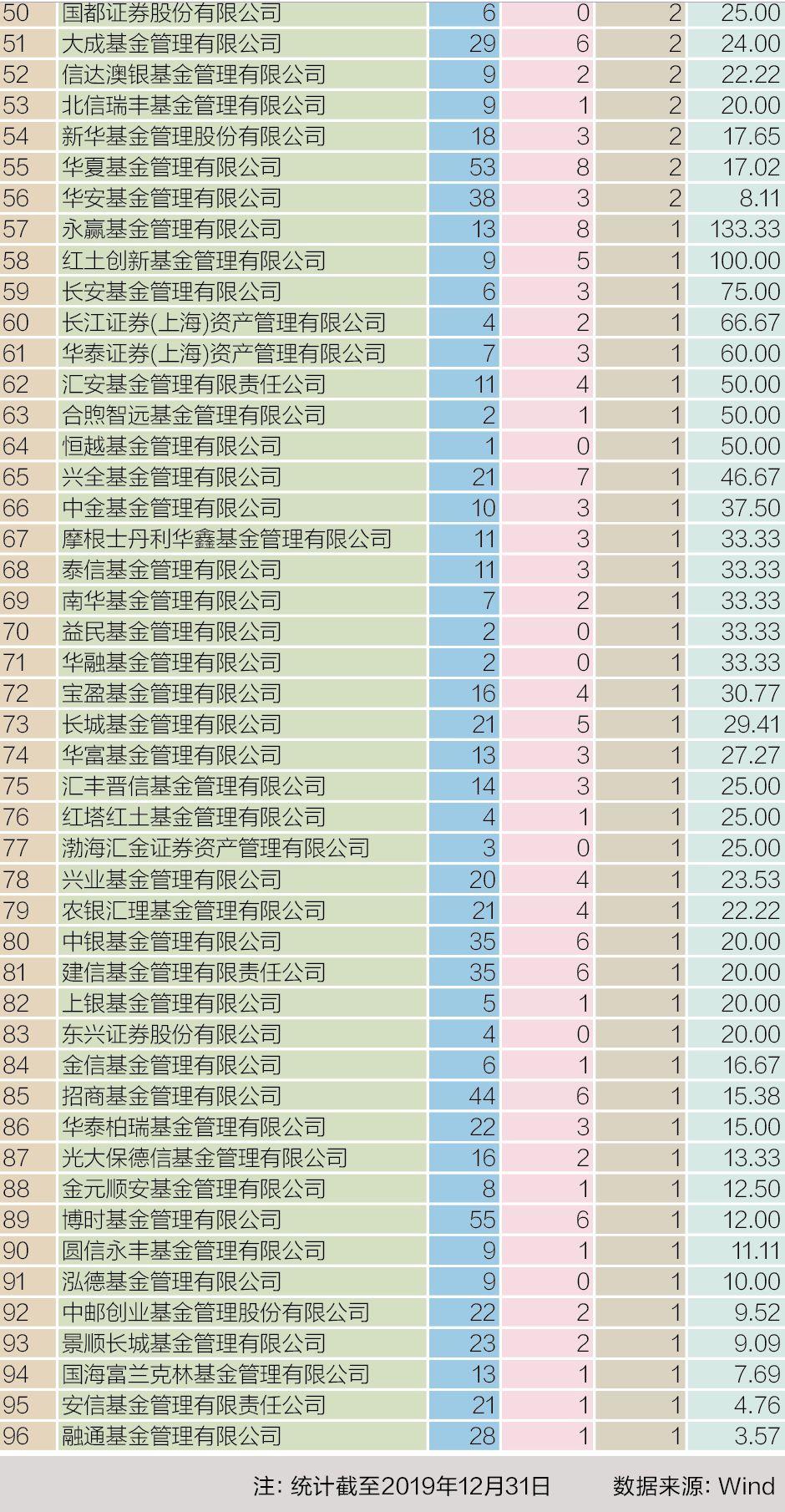 若根据基金经理变动率排名,截至2019年末,中泰证券(上海)资产管理有限公司变动率为400%,排名第一;弘毅远方基金的基金经理变动率为300%,排名第二;国融基金以200%的基金经理变动率位居第三,嘉和基金、中科沃土基金、永赢基金、方正富邦基金、红土创新基金、新沃基金、凯石基金的基金经理变动率均在100%以上。