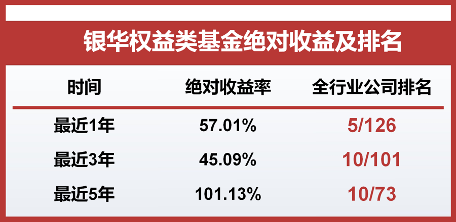 银华基金旗下权益类基金绝对收益及排名概况