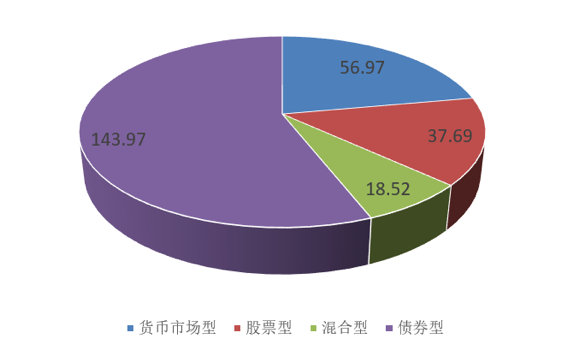 具体来看,货币型基金、股票型基金、混合型基金、债券型基金规模分别为56.97亿元、37.69亿元、18.52亿元、143.97亿元,较去年同期分别增长3.54亿元、18.23亿元、2.74亿元、25.3亿元。